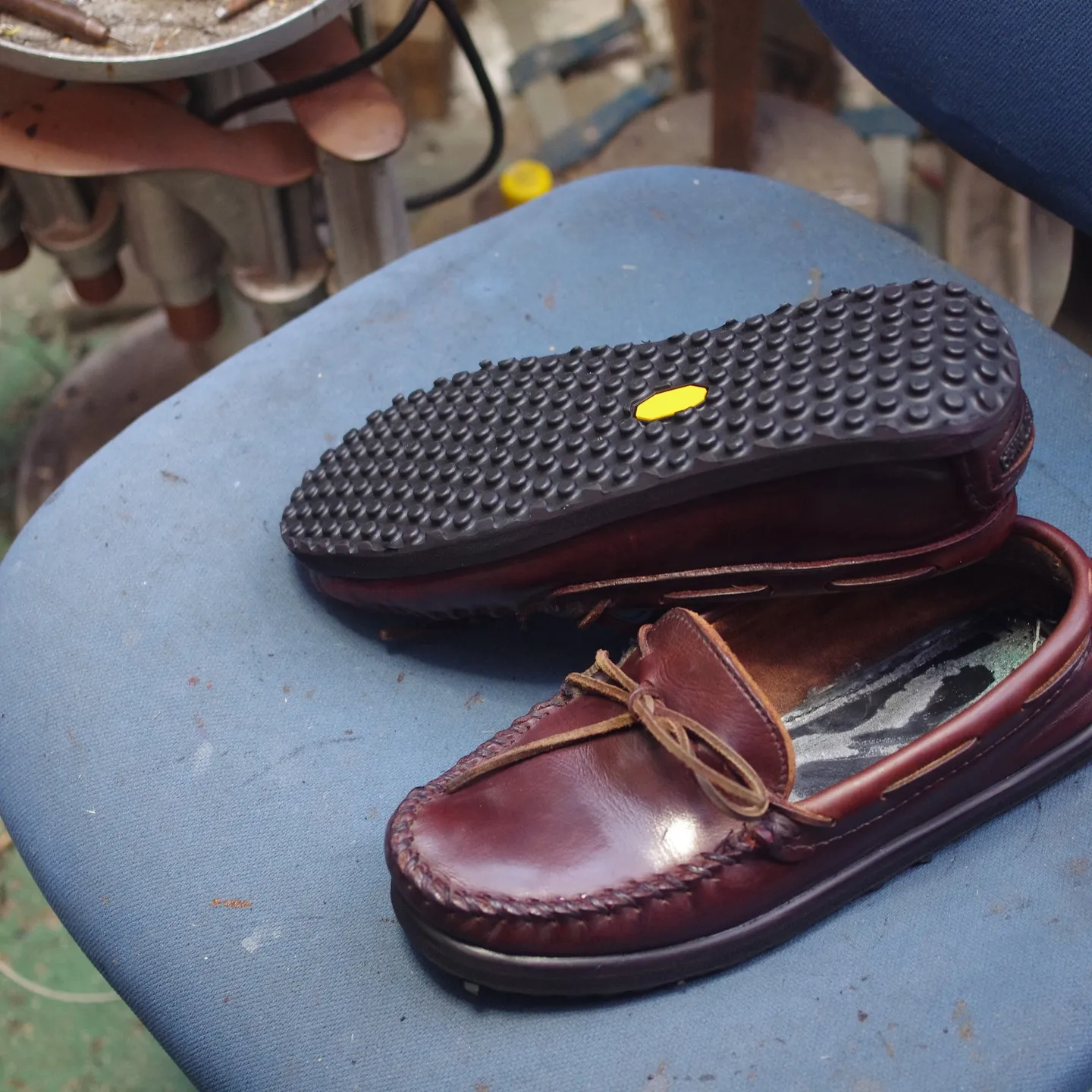 【神奈川県 T様】ミネトンカ(Minnetonka)ドライビングシューズ|革当て補強&Vibram477Bによるオールソール交換修理