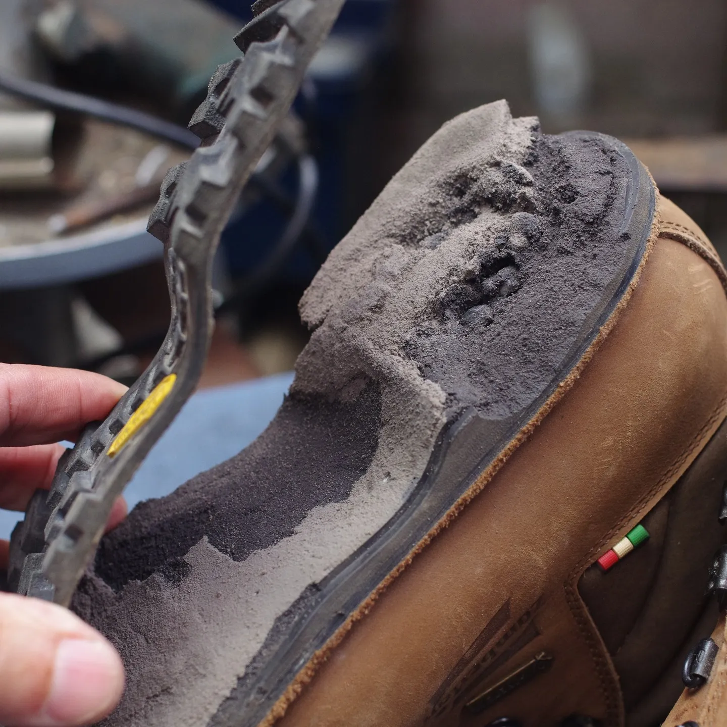 「とりあえず強力な糊で貼っておく」という安易な修理を行えば、過酷な山道でソールが剥がれるという最悪の事故に繋がりかねません。H様に安心して長く履いていただくため、当店ではこのベース部分からの抜本的な作り直しを決断しました。