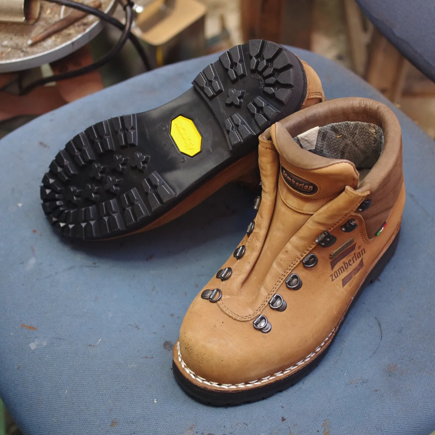 遠方のお客様からのご依頼が増えており、職人冥利に尽きる毎日です。今回は滋賀県のH様より、登山靴の名門イタリア・ザンバラン社の名作モデル**「フジヤマ(Fujiyama)」**の修理をご依頼いただきました。
