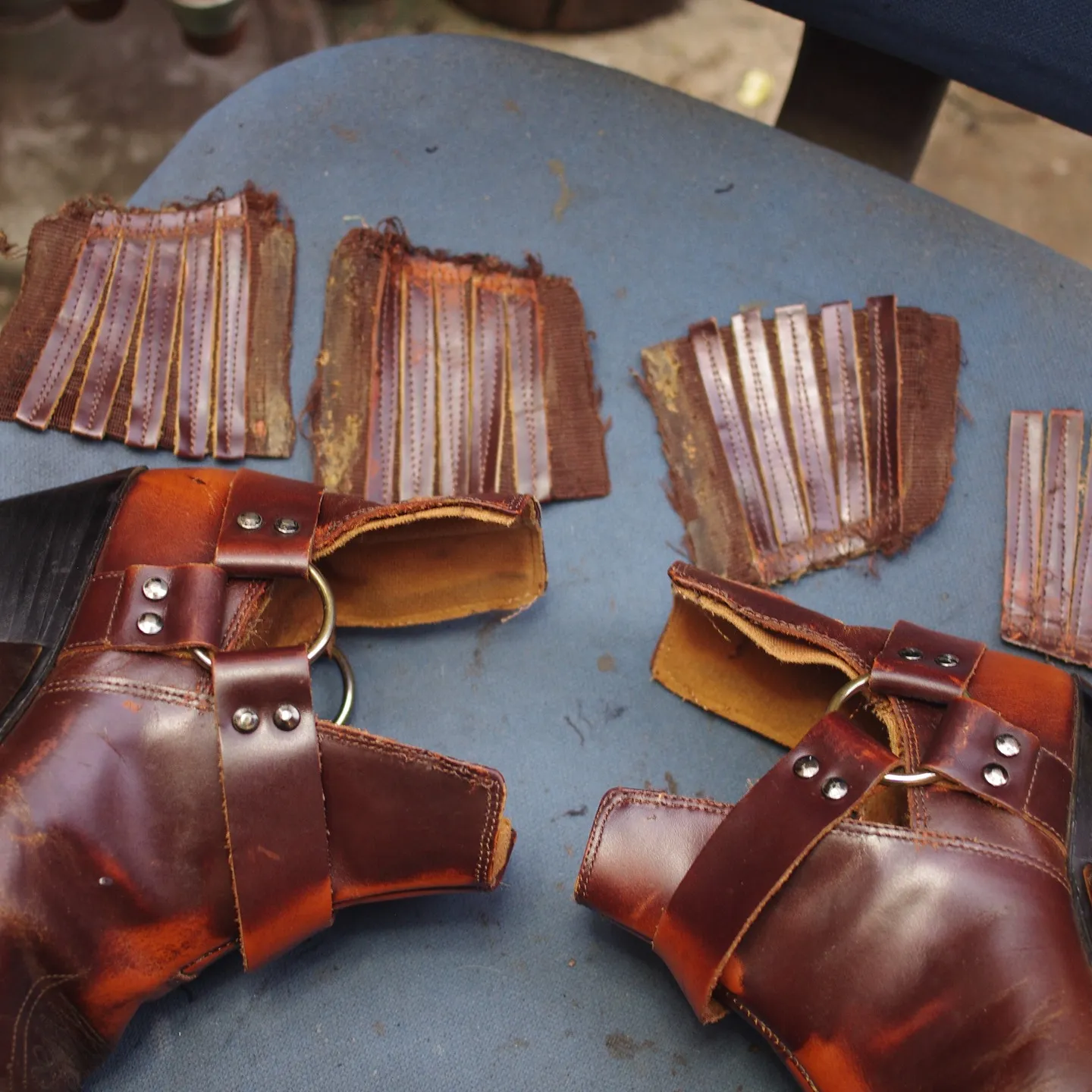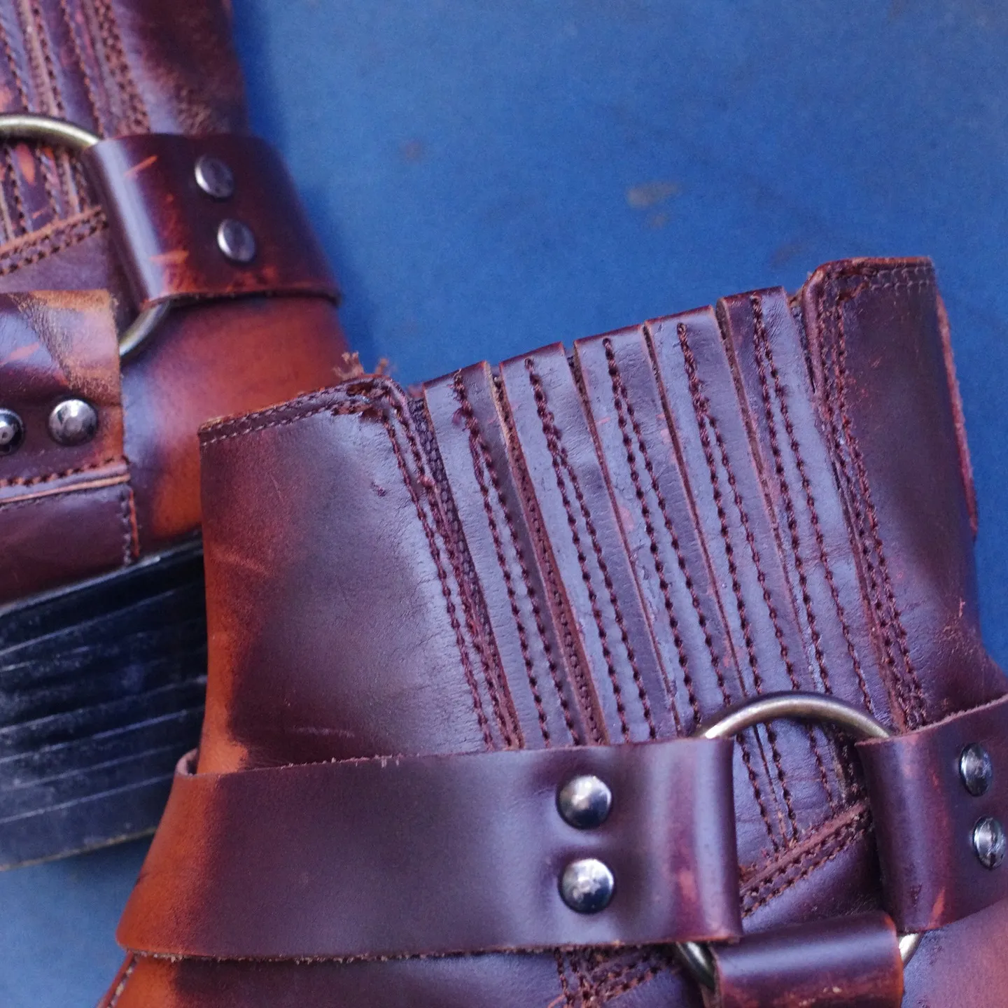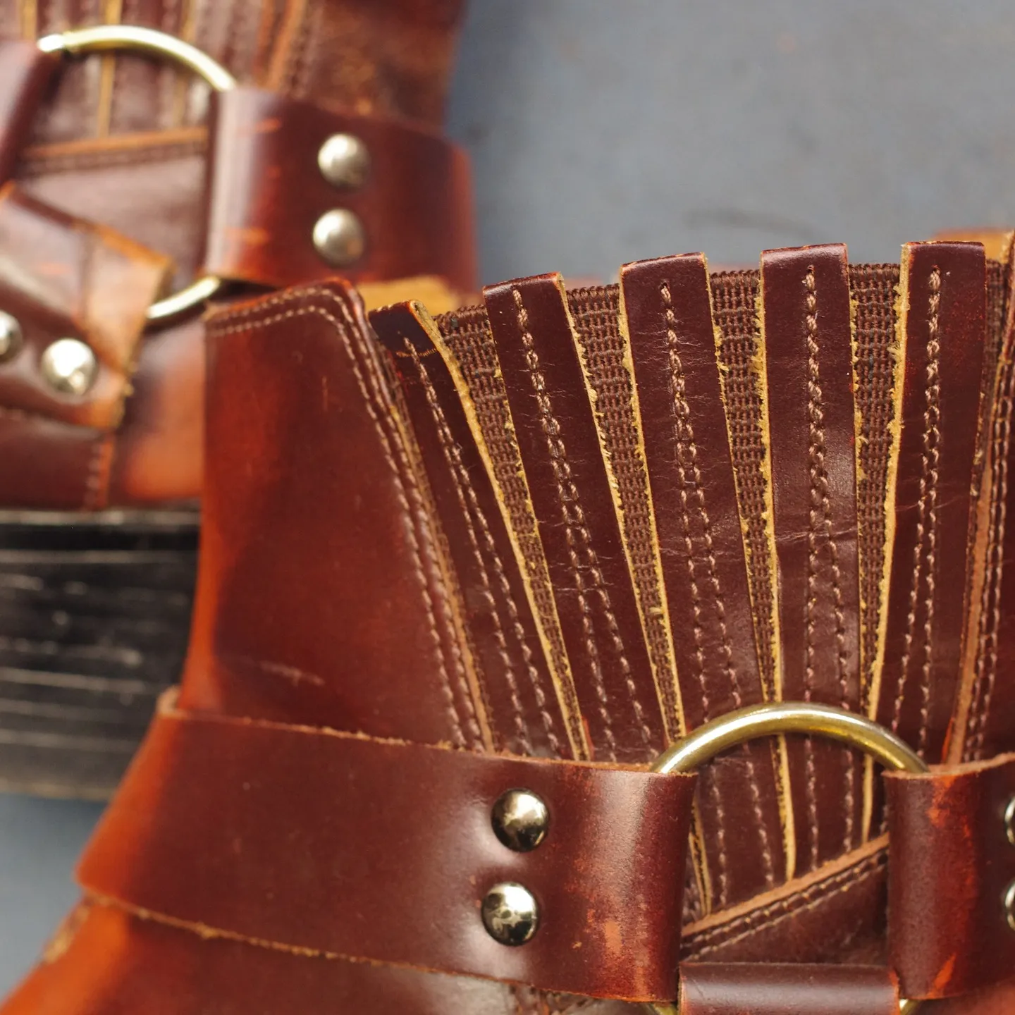 ウエスタンブーツは独特のデザインと多くの革のヒダが特徴で、ゴアゴム交換時の作業が複雑です。S様のブーツではヒダすべてにゴアゴムが縫い付けられており、一つひとつ丁寧にゴムを取り外してから新しいゴムを縫い付ける必要があります。