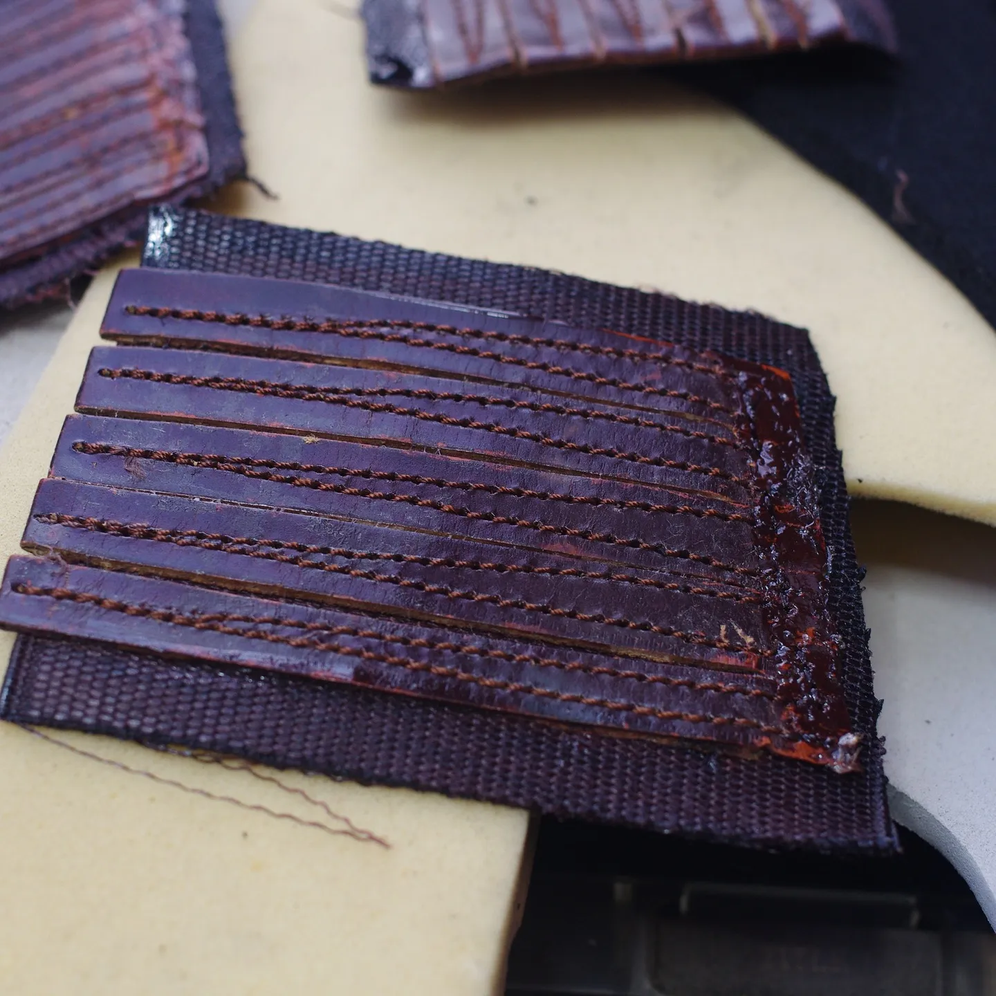 革のヒダを傷つけずに作業するために、ゴアゴムとヒダ部分を一旦取り外し、別々に作業を行います。取り外したゴアゴムに新しいゴムを縫い付けてから、本体に戻す工程は高度な技術が求められます。この工程を経て履き心地が大幅に回復し、まるで新品のようなフィット感を得られます。