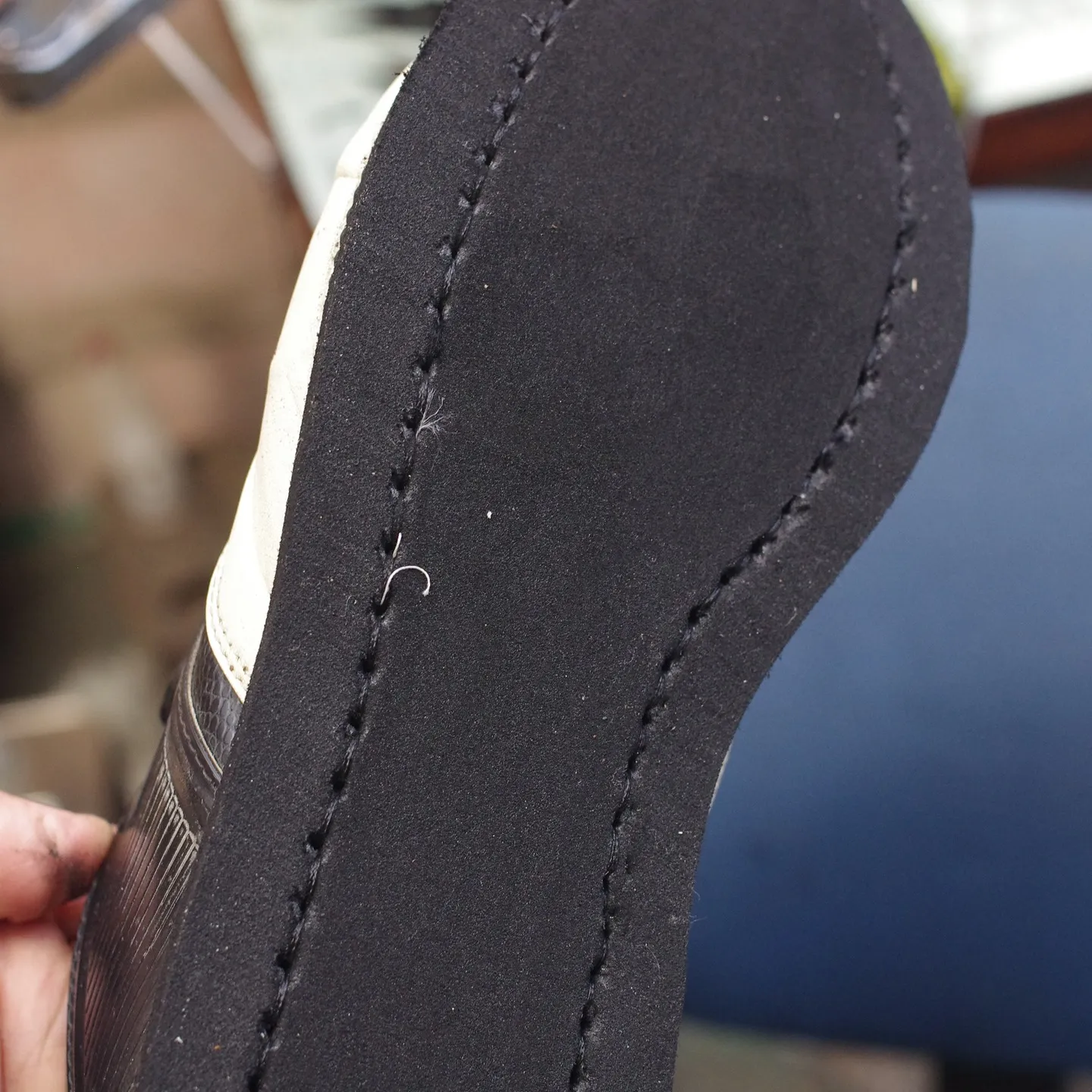 まずは、長年の使用で摩耗した古いソールを慎重に剥がしていきます。 接着剤の残りカスや汚れを丁寧に取り除き、アッパー(靴本体)の状態をチェックします。この段階で、見えない部分のダメージを補修しておくことが、最終的な仕上がりの美しさと強度に繋がります。