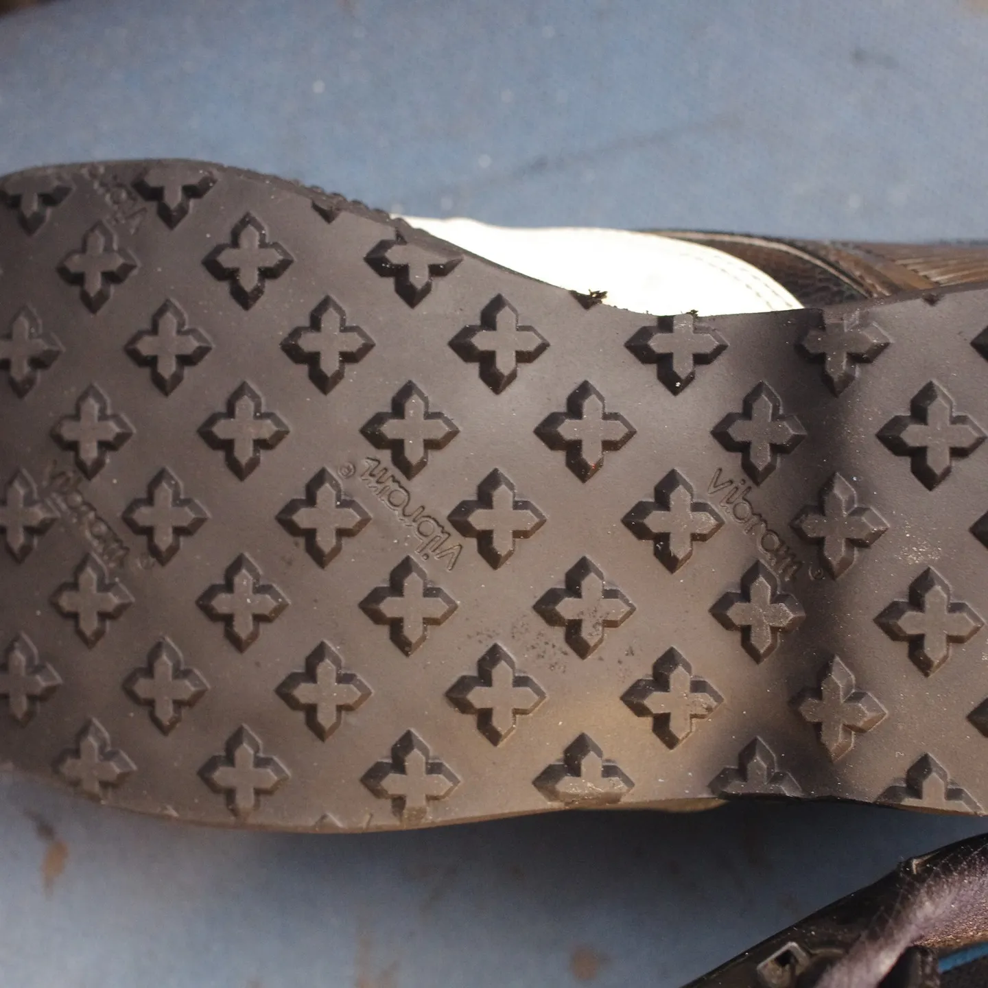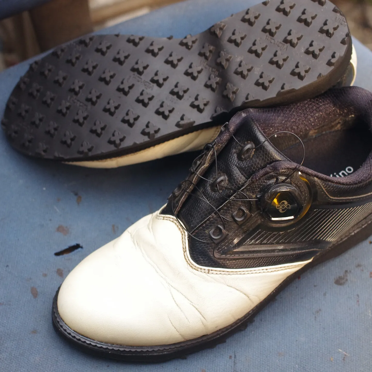 お預かりした際の状態を確認すると、スパイクレスの命とも言えるソールの突起(スタッド)が摩耗し、ほぼ平坦に近い状態になっていました。 ゴルフにおいて、足元の滑りはスイングの乱れに直結し、スコアだけでなく怪我のリスクも高めます。「まだ履けるけれど、滑るのが不安……」そんなお悩みを解消するため、今回は最高峰のソールメーカー・Vibram(ビブラム)社のソールを用いたフルリニューアルをご提案しました。