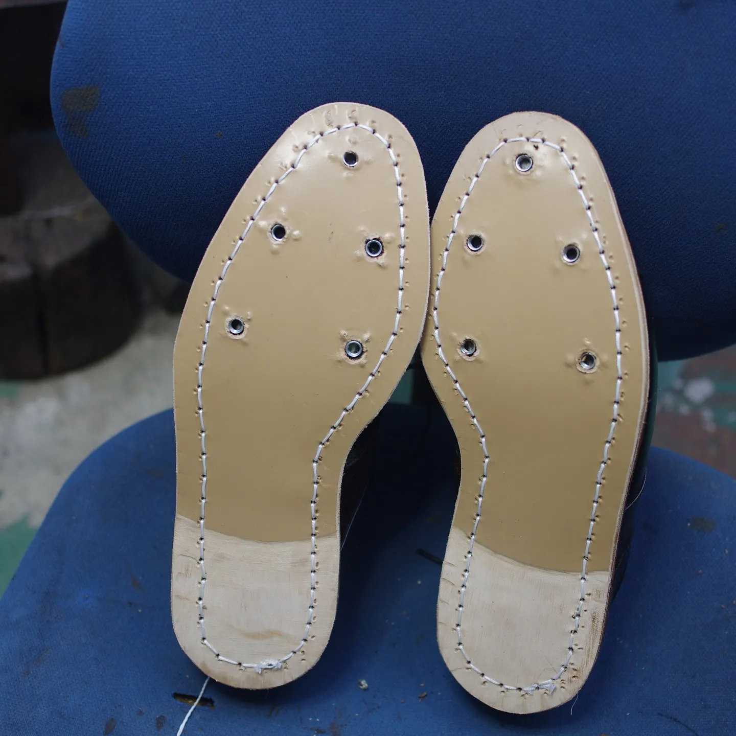 今回、新しいソールとして採用したのは**最高級の本革(ベンズ)**です。 現代のゴルフシューズは樹脂製が主流ですが、かつての名靴たちは皆、革底でした。本革ソールには以下のメリットがあります: