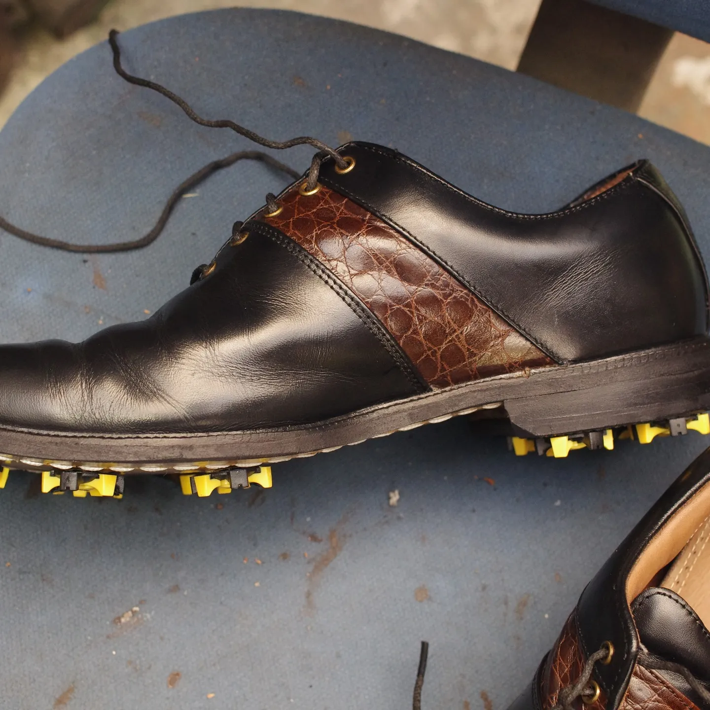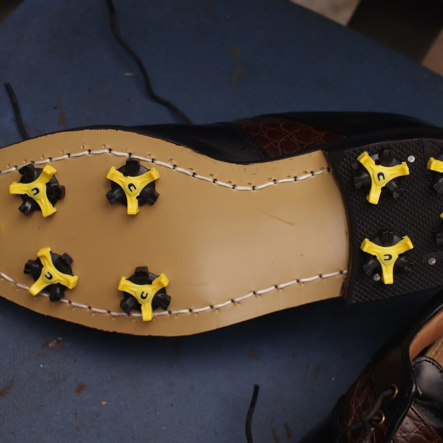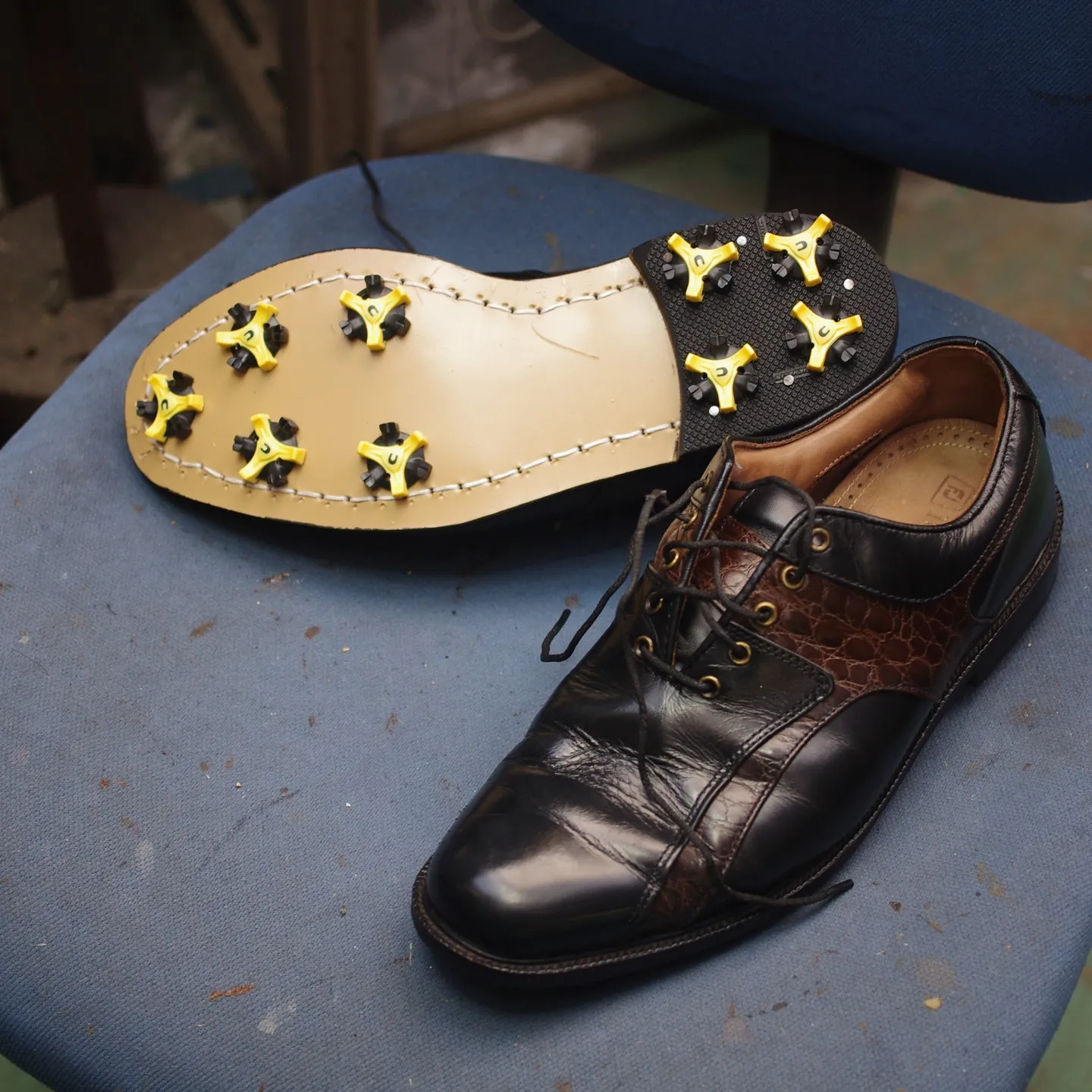 革底は適度な硬さがあるため、地面からの情報を足裏にダイレクトに伝えてくれます。芝の状態、傾斜の感覚……。これらは厚い樹脂ソールでは味わえない繊細なフィードバックです。 S様のスイングを足元から支え、力強いインパクトを生み出す「土台」として、これ以上ない仕上がりとなりました。