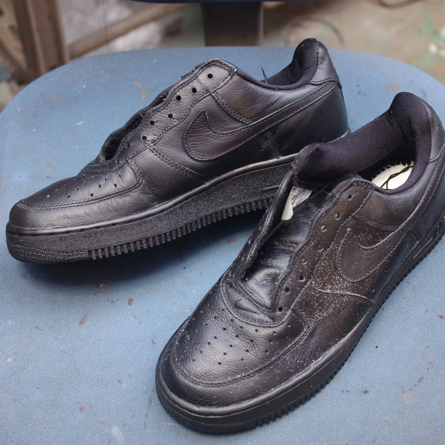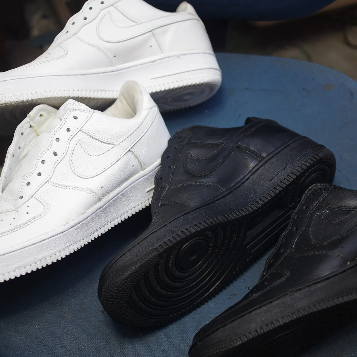 白のエアフォースには清潔感のある白糸を、黒には重厚感のある黒糸を。N様の2足は、この工程を経て、工場から出荷されたばかりの新品にはない「職人の手仕事」が宿る一足へと生まれ変わりました。