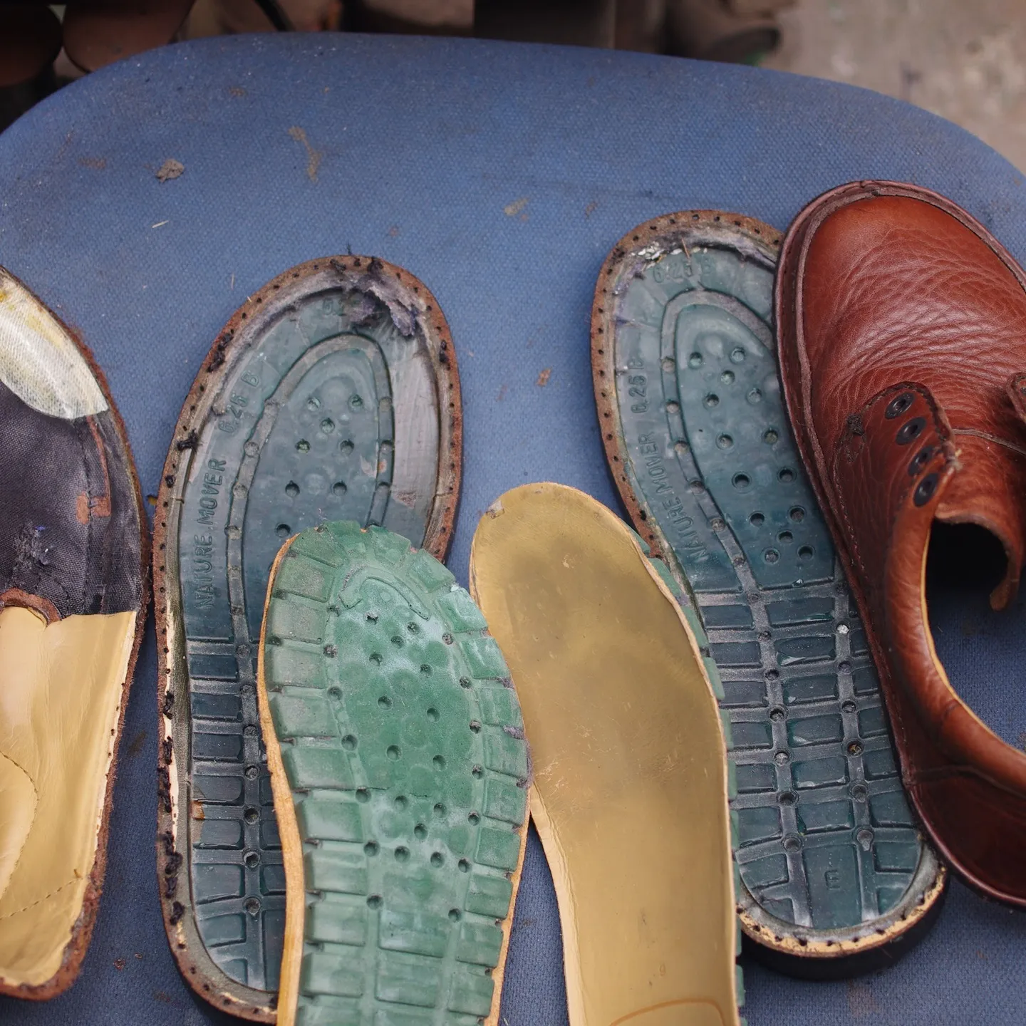 私たちの仕事は、単に外側のゴムを貼り替えるだけではありません。長く履き続けていただくために、内部構造にも徹底的に手を入れました。