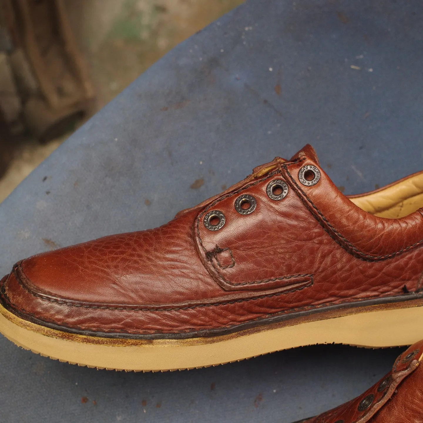 工房のライトの下で、新しく装着されたVibram 2060のサンドベージュが、落ち着いたブラウンのレザーを引き立てています。手に持つと、その軽さに驚かされます。そして何より、ソールが新しくなったことで靴全体のシルエットがシャープになり、「長年履き込まれた風格」と「新品のような清潔感」が同居する、唯一無二の佇まいとなりました。