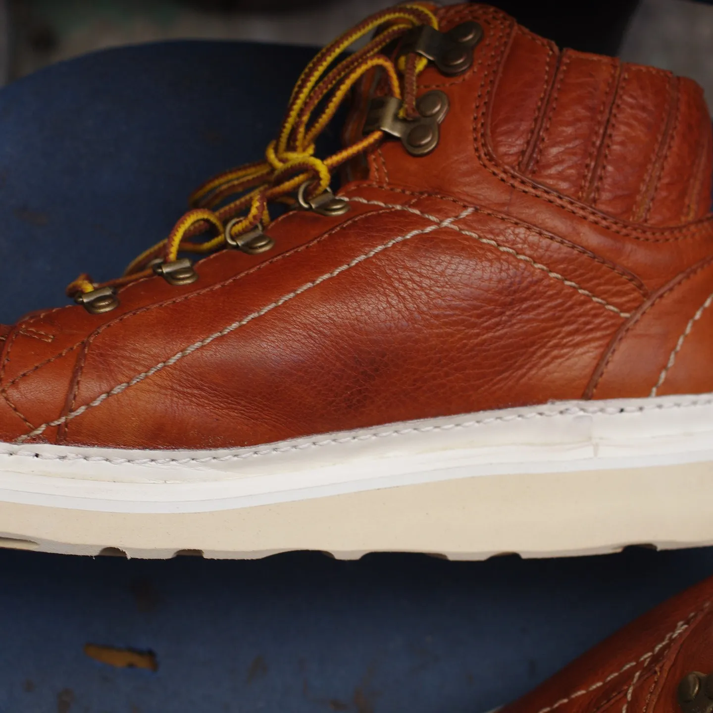 手仕事の精度: ブーツの曲線に合わせて革を裁断し、一針一針丁寧にサイドを縫い付けています。これにより、既製品にはない「ハンドクラフト感」溢れる表情が生まれました。