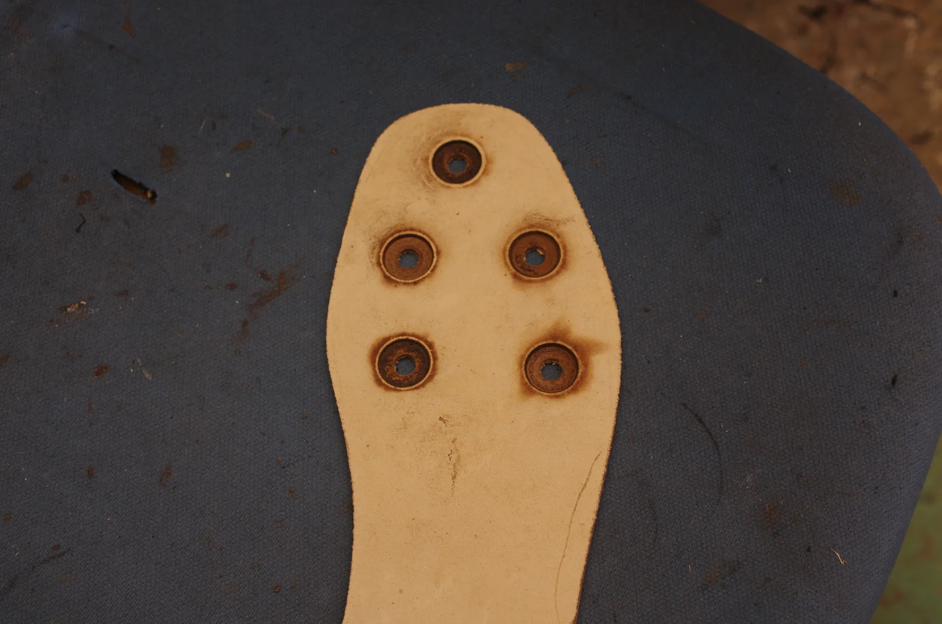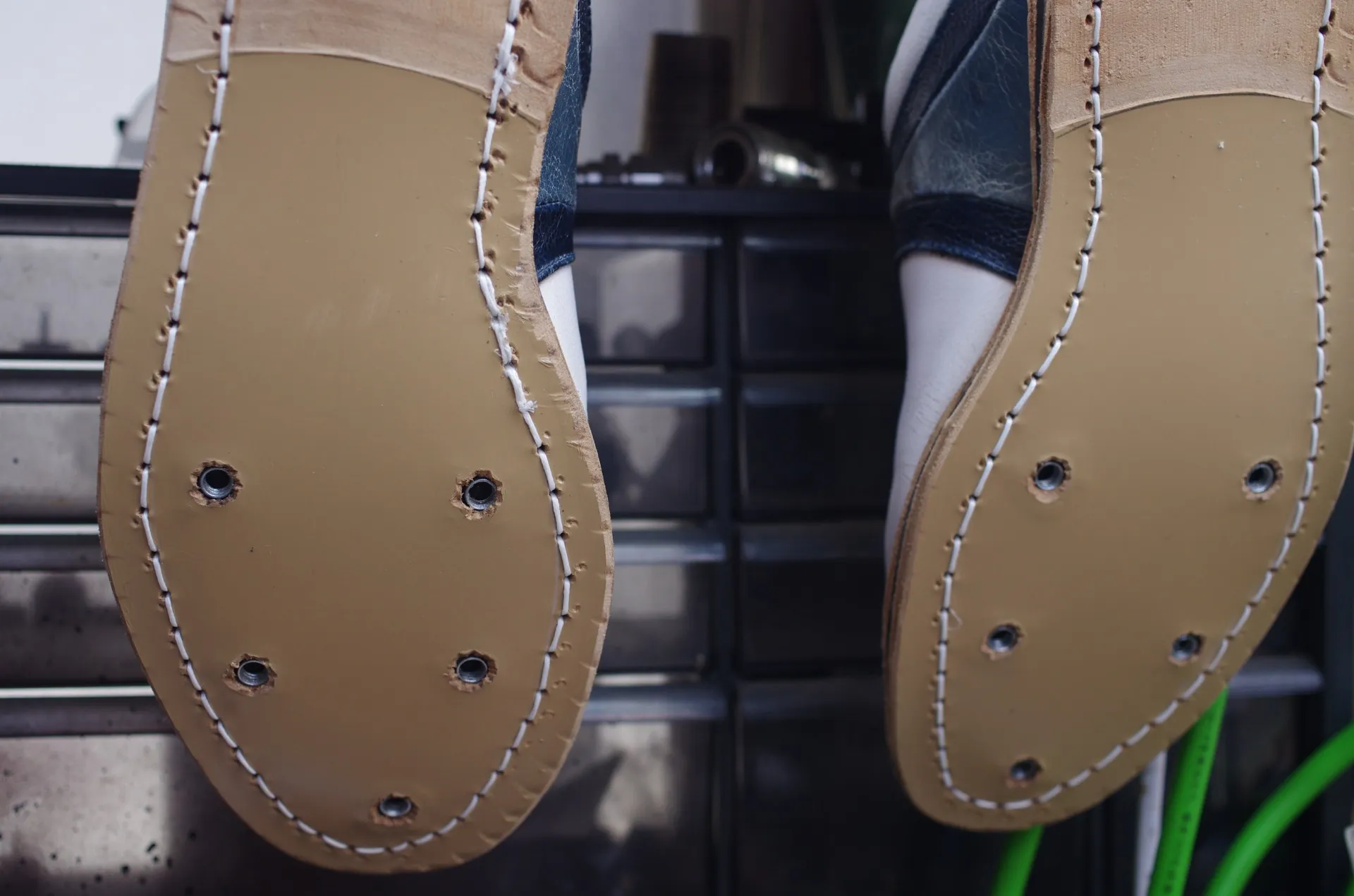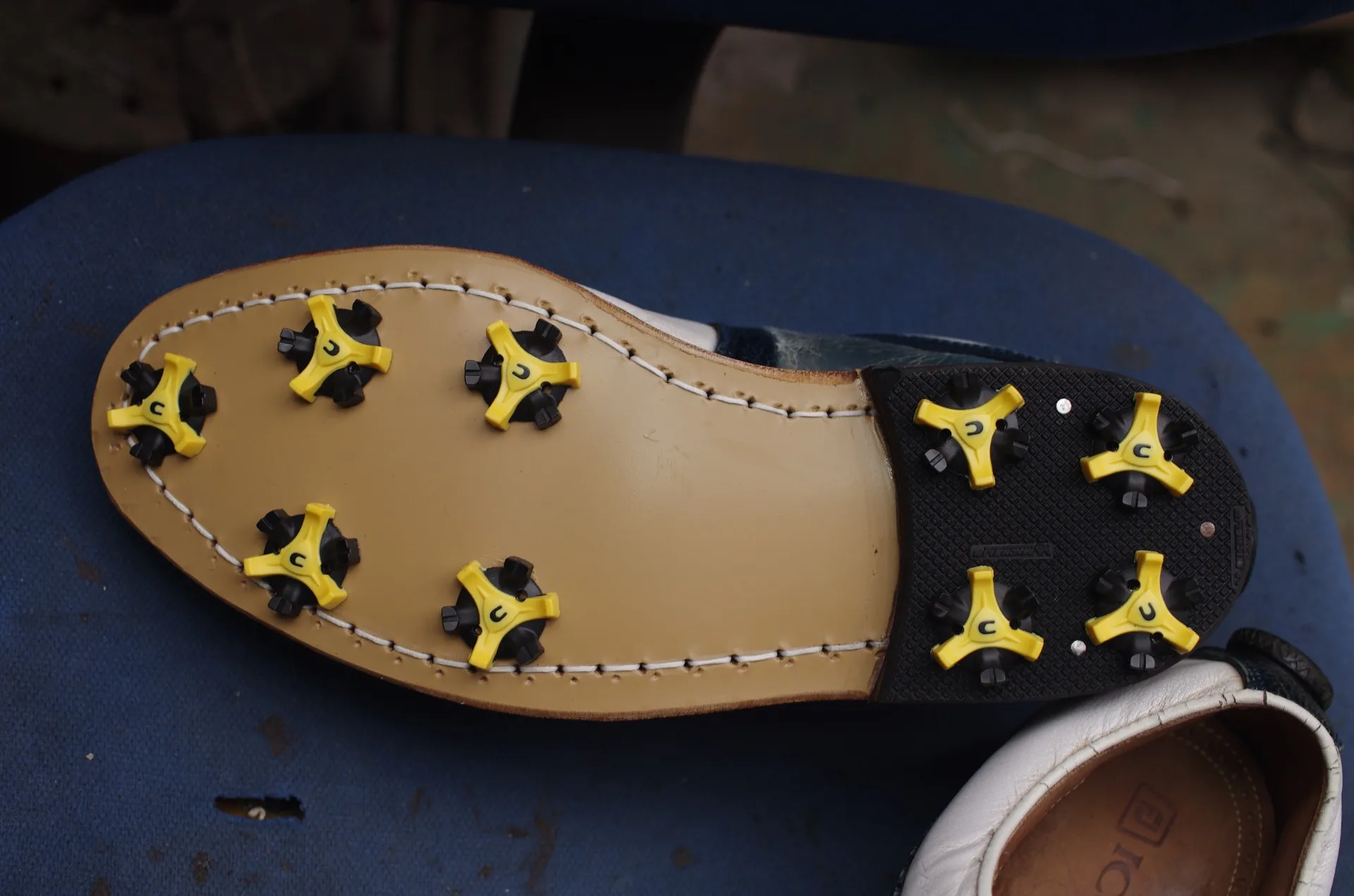 本革ソールをゴルフシューズとして機能させるための最重要工程です。 ソールの内部に**「座刳り」**を入れ、ソフトスパイクを装着するための「メスネジ」を精密に埋め込みました。これにより、摩耗したスパイクを何度でも交換できるようになり、シューズの寿命が飛躍的に伸びます。